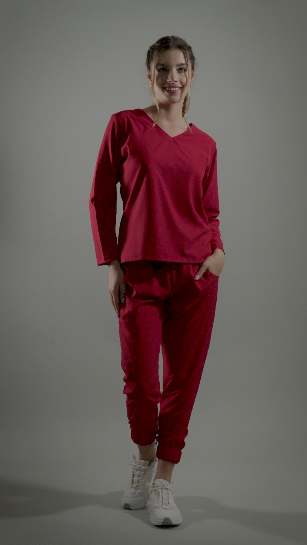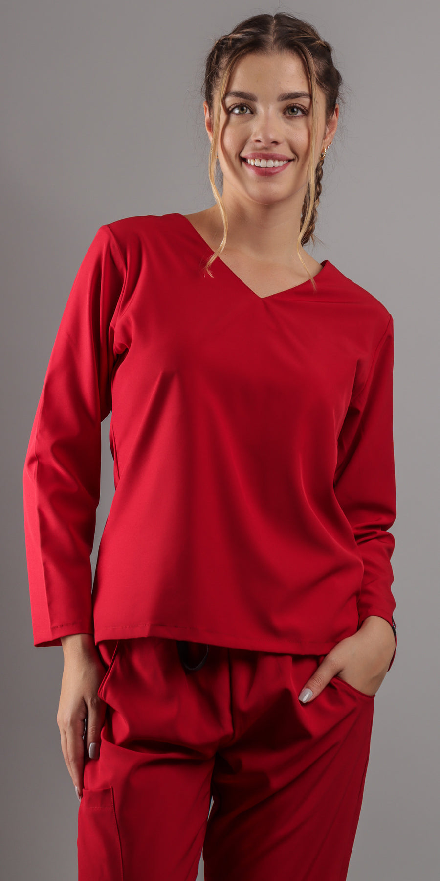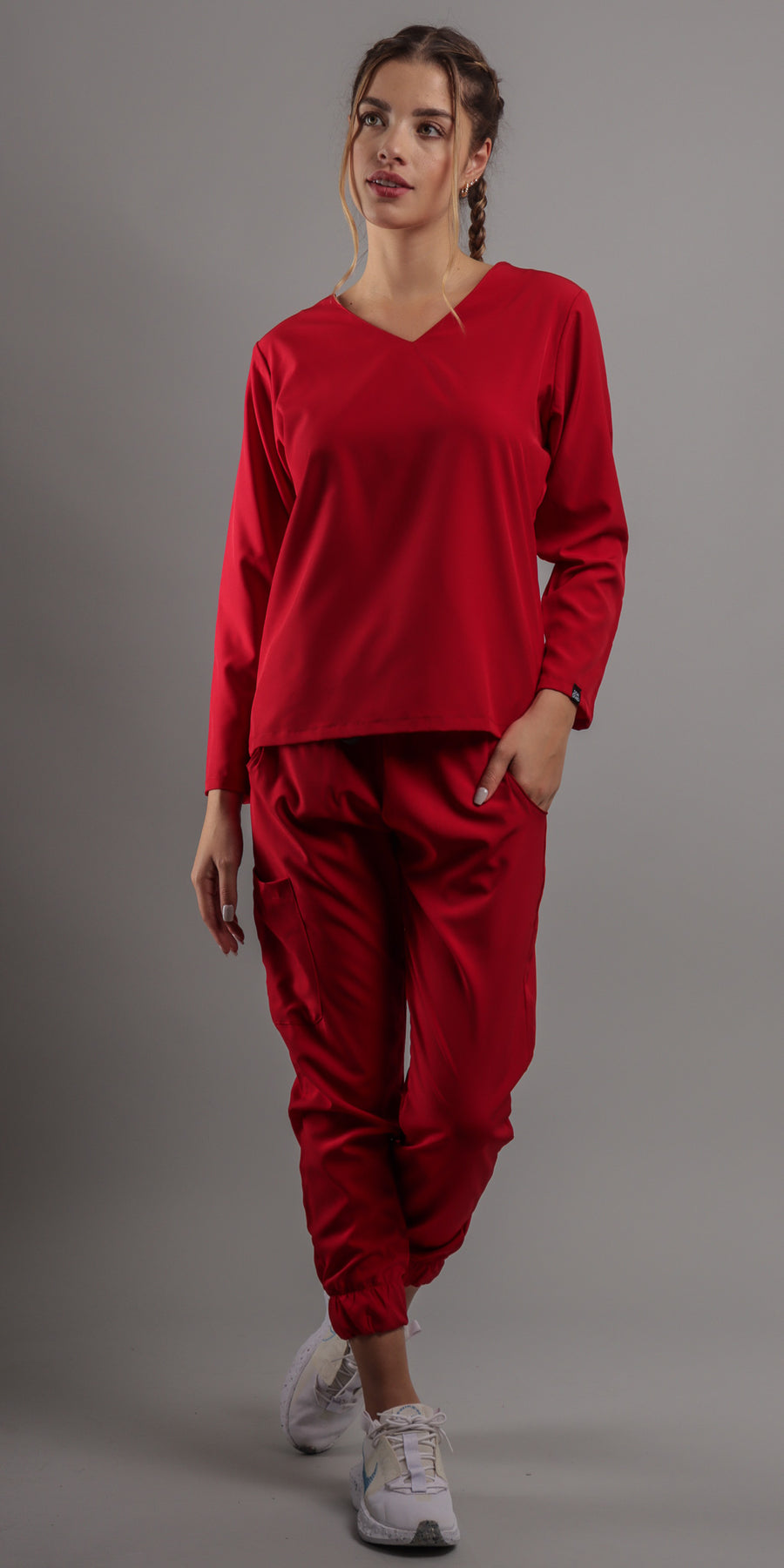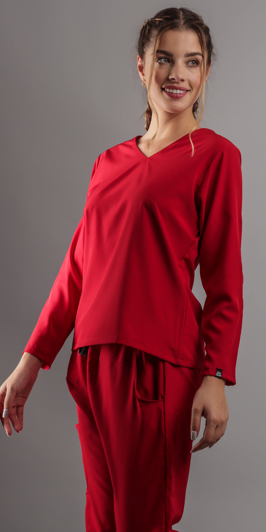 1. Estilo Elegante con Cuello en V: La parte alta del scrub presenta un favorecedor cuello en V, complementando con una manga larga que agregara un toque de sofisticación a tu atuendo. El corte moderno te asegura lucir diferente y a la moda en todo momento.