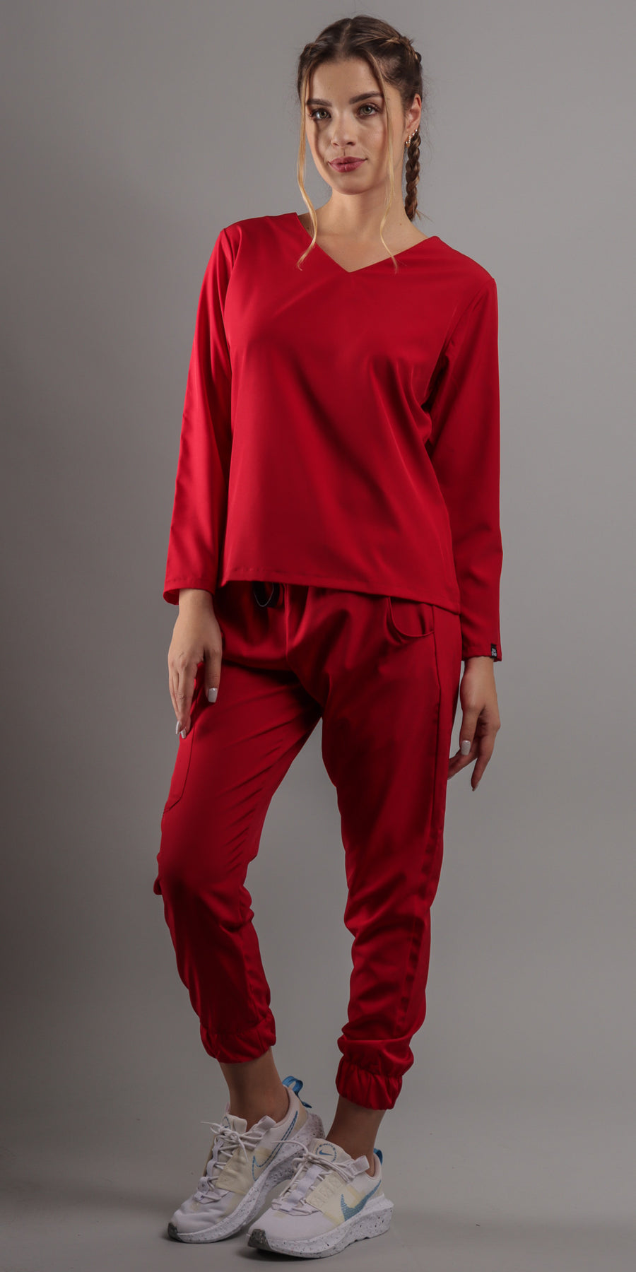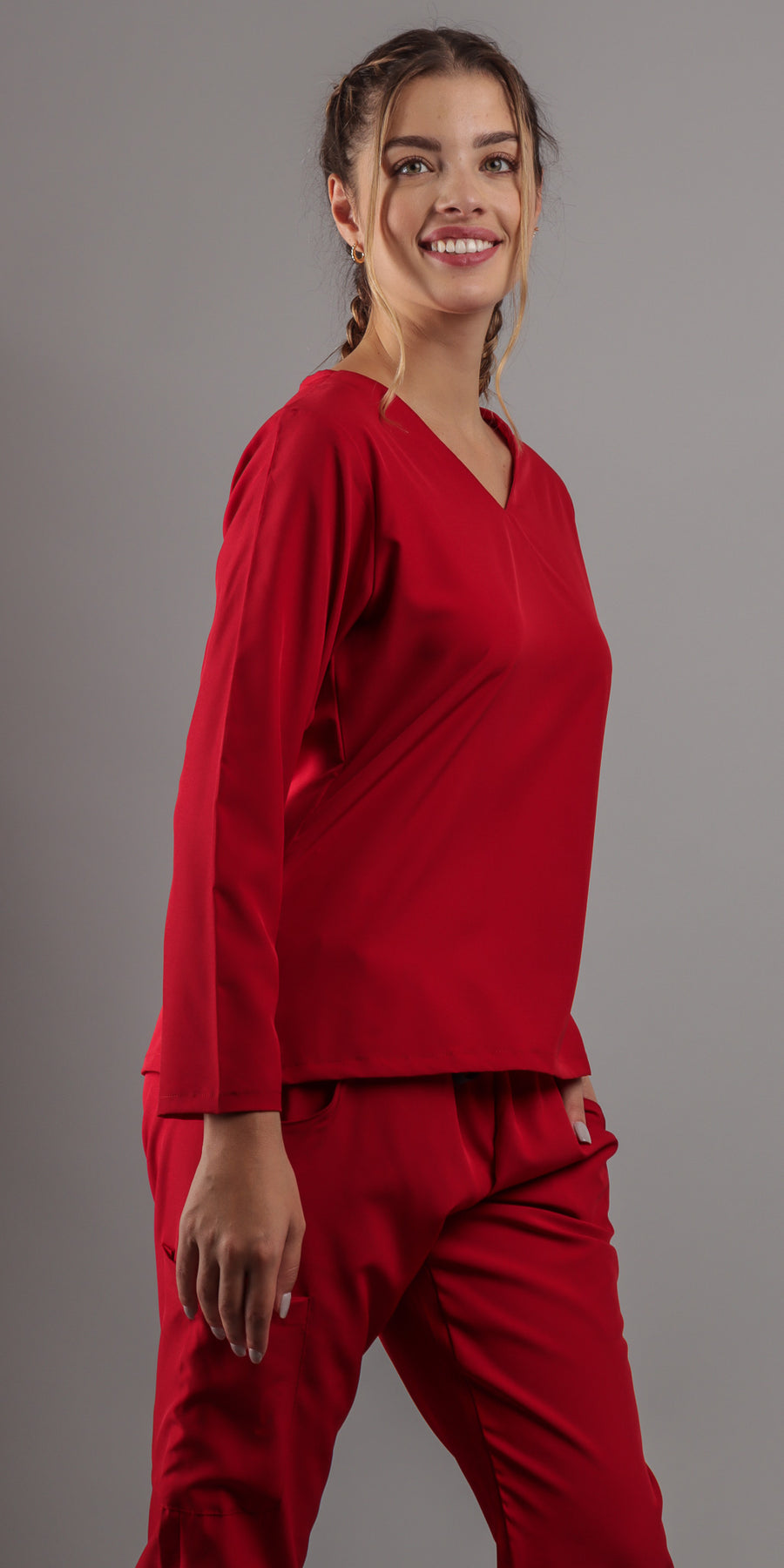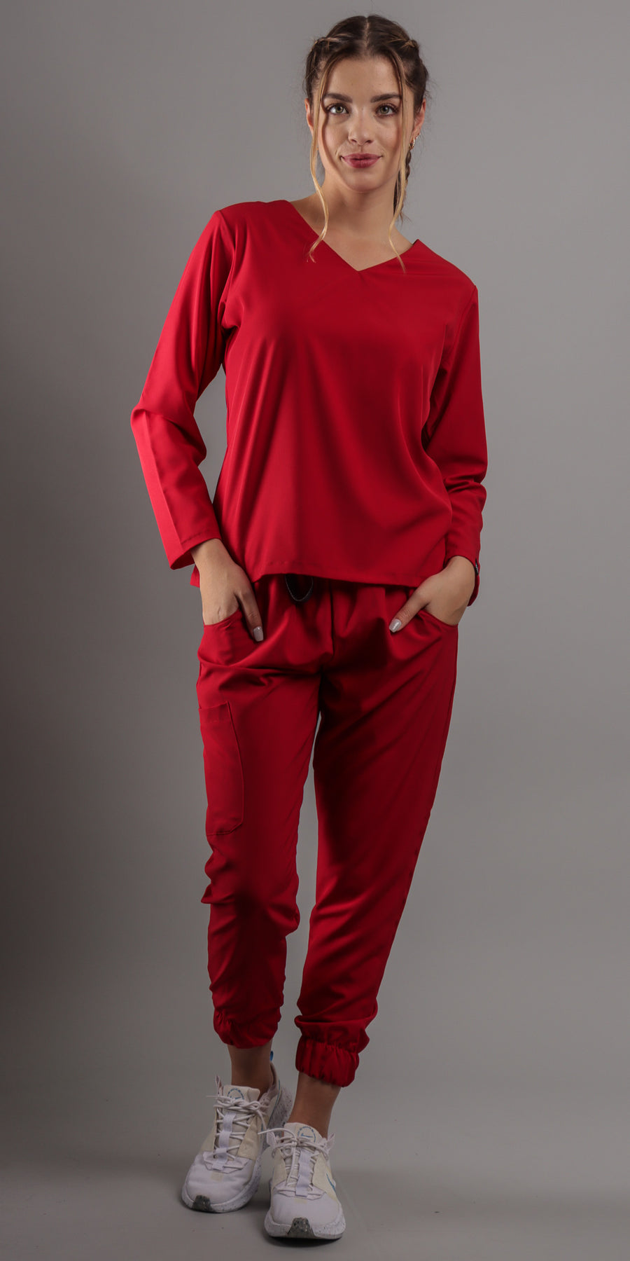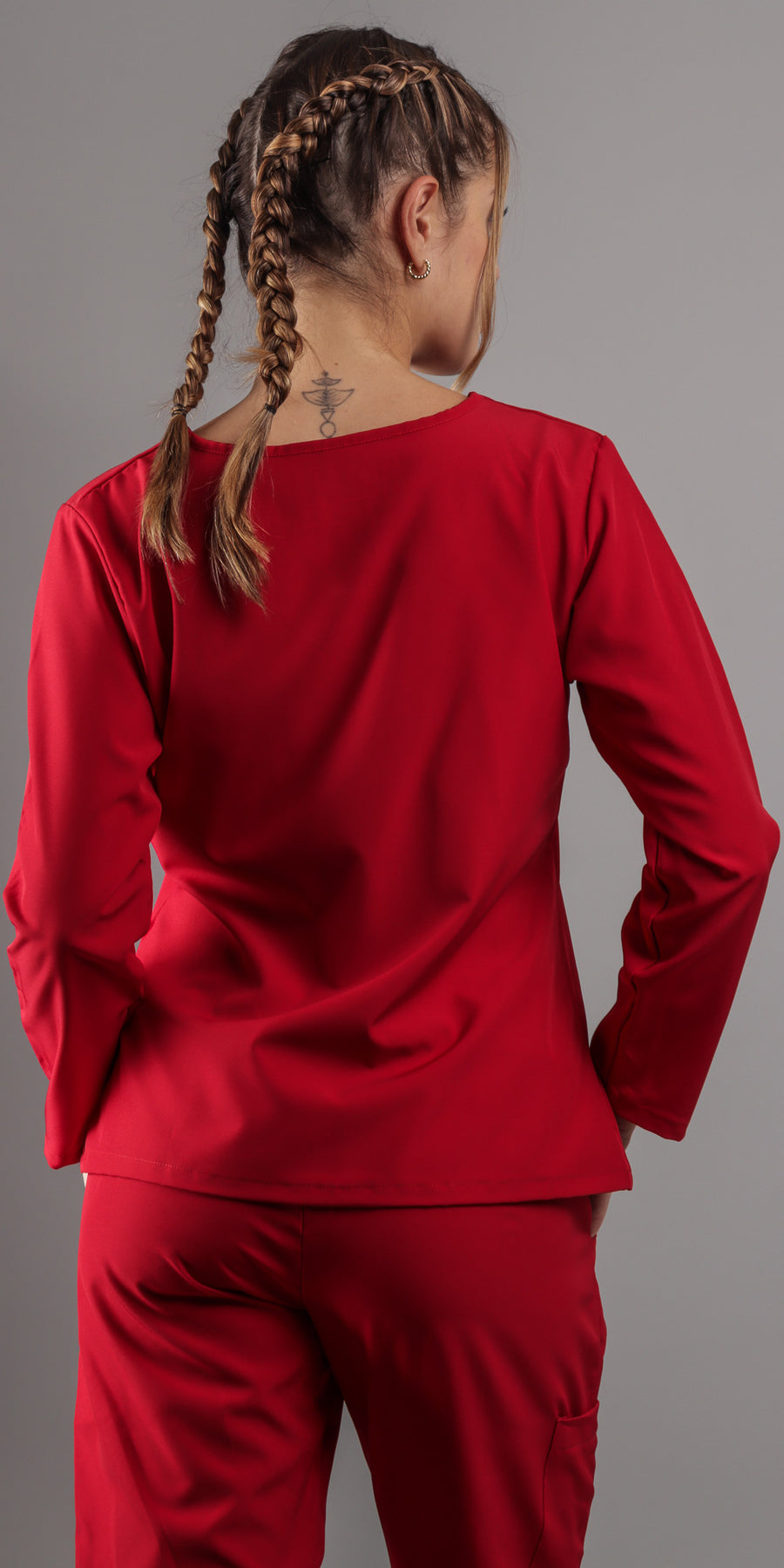 1. Estilo Elegante con Cuello en V: La parte alta del scrub presenta un favorecedor cuello en V, complementando con una manga larga que agregara un toque de sofisticación a tu atuendo. El corte moderno te asegura lucir diferente y a la moda en todo momento.
