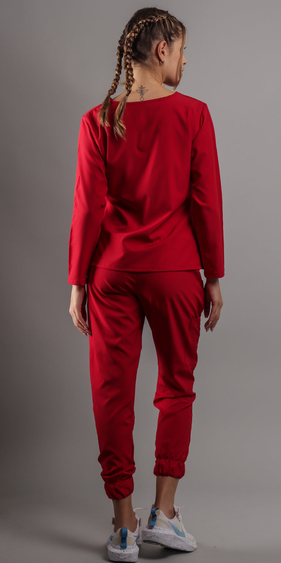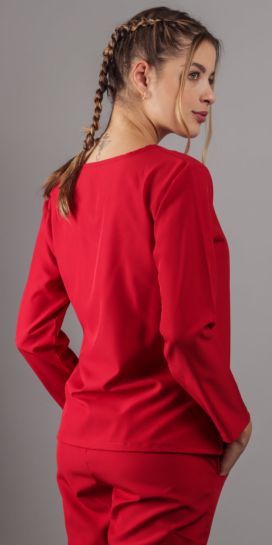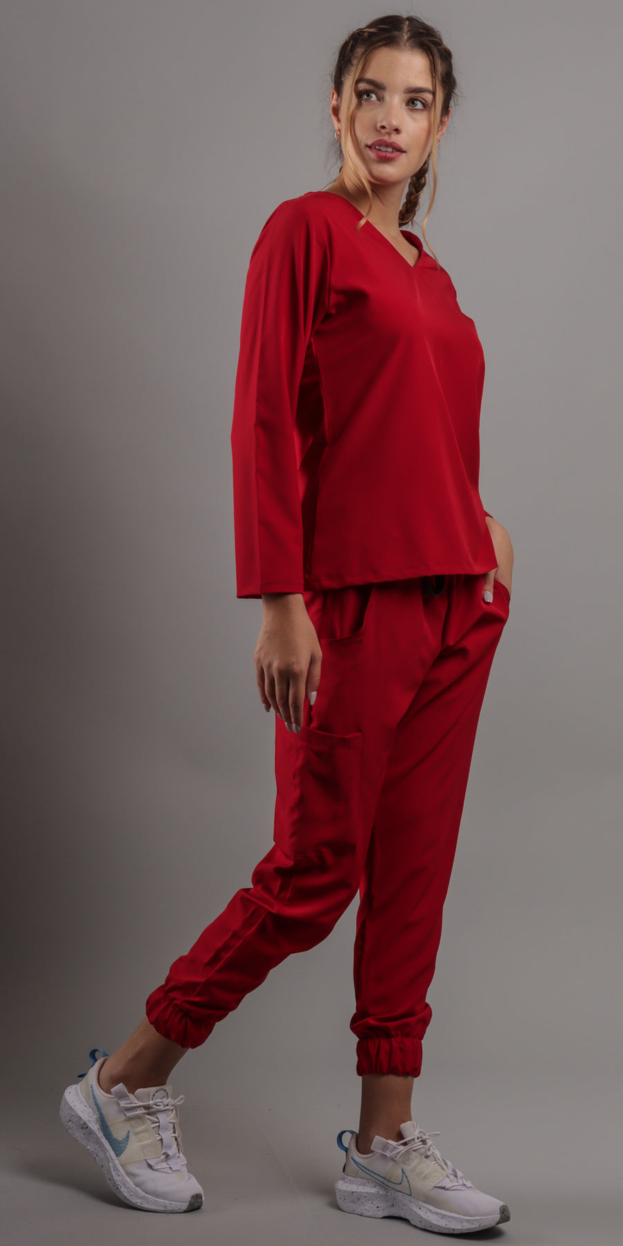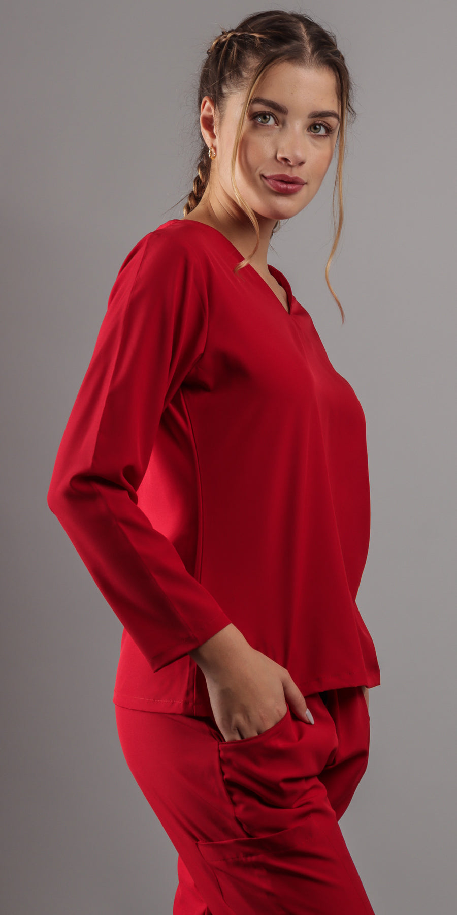 1. Estilo Elegante con Cuello en V: La parte alta del scrub presenta un favorecedor cuello en V, complementando con una manga larga que agregara un toque de sofisticación a tu atuendo. El corte moderno te asegura lucir diferente y a la moda en todo momento.